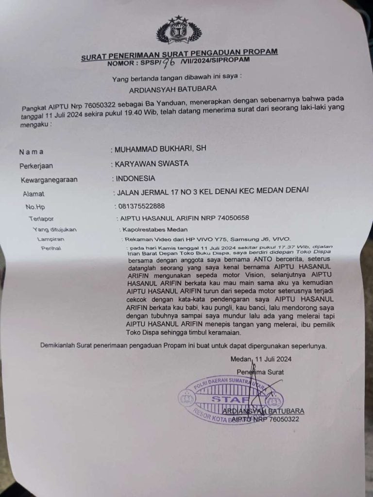 Dalam surat laporan itu, yang diadukan yaitu Aiptu Hasanul Arifin bertugas di Polsek Medan Timur, kejadian dijalan Irian Barat Medan Sebagai pembuktian, korban memberikan hasil vidio rekaman kepada penyidik, adanya keributan disebabkan Aiptu Hasanul Arifin yang terlebih dahulu mengajak ribut, bahkan masyarakat yang melerai keributan itu ditepis oleh Aiptu Hasanul Aripin.Yang bertugas di Si Propam Mapolresta Medan, sebagai penerima surat Aiptu Ardiasyah Batubara pada tanggal 11 Juli 2024.